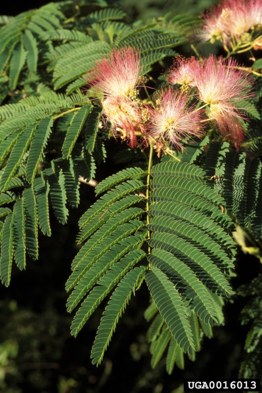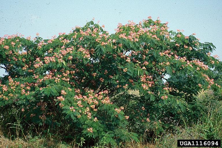 Feathery pink flowers. Gets mimosa web worm which turns foliage brown.