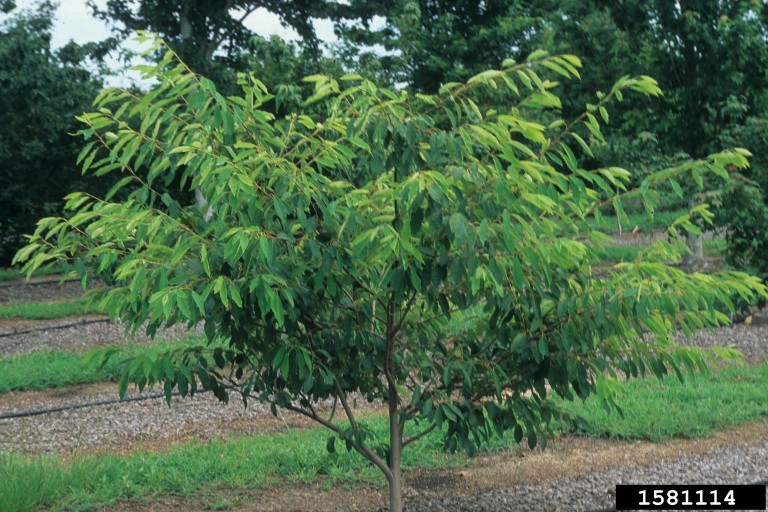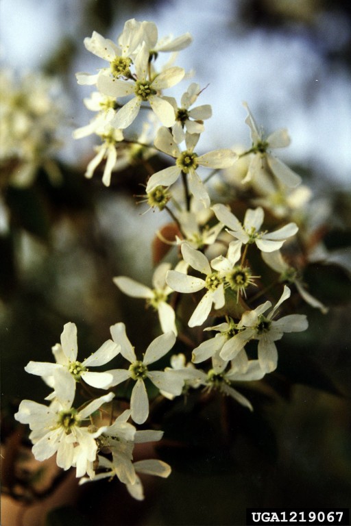 White pubescence on new growth-showy white flowers early in spring-edible blue fruit in June.