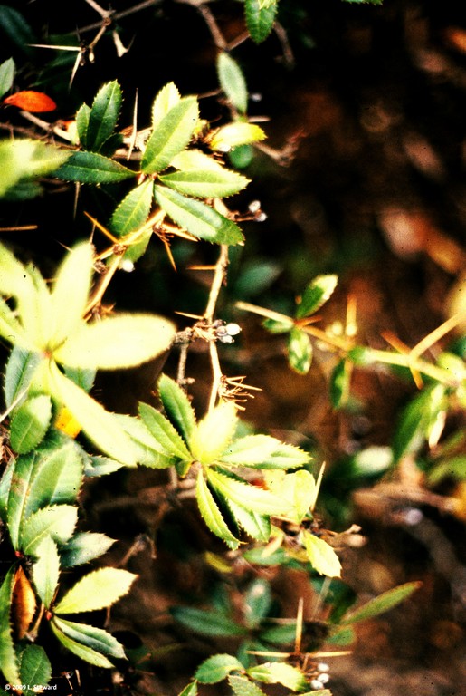 Most cold tolerant of the evergreen barberries. Showy blue fruit. Persistant 3-spine thorns at each node.