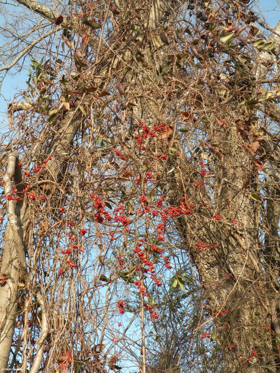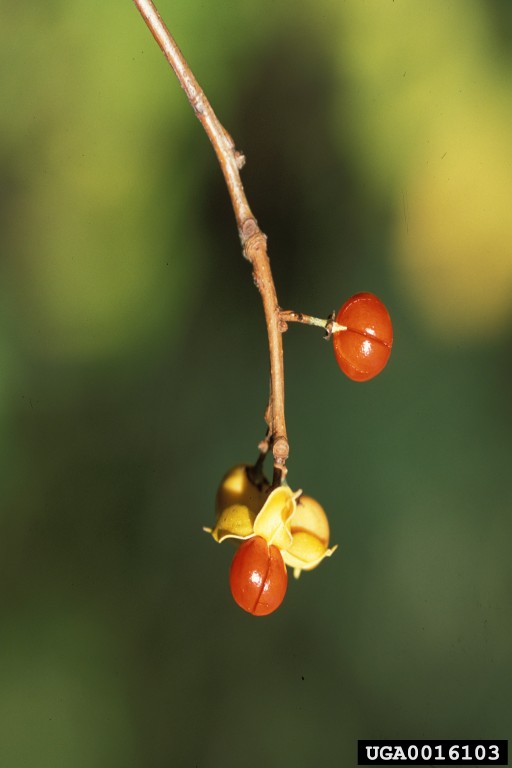 Shoey orange-red fruit in clusters that are used for fall decoration. Very invasive. Dioecious or separate sex plants.