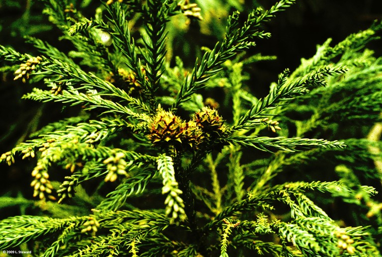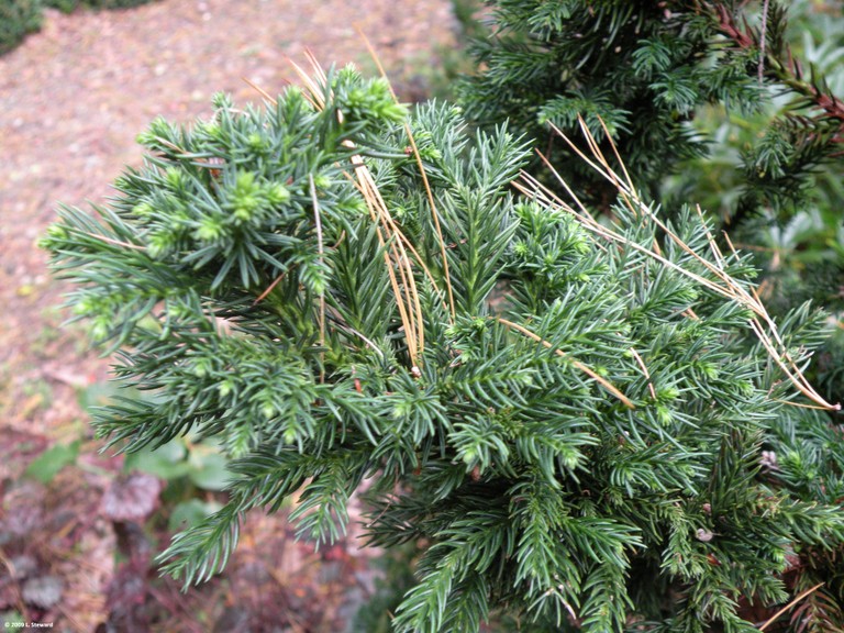 Upright growing evergreen with green to blue needles in the adult form. Juvenile form is not cold hardy in northern regions. It has feathery purple foliage.