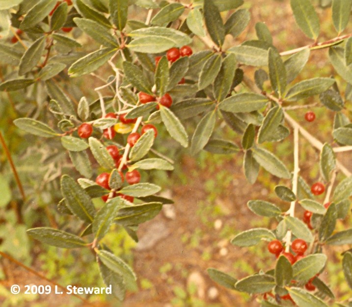 Southern holly withred, yellow and white fruit. Very large shrub, weeping shrub and dwarf forms available.