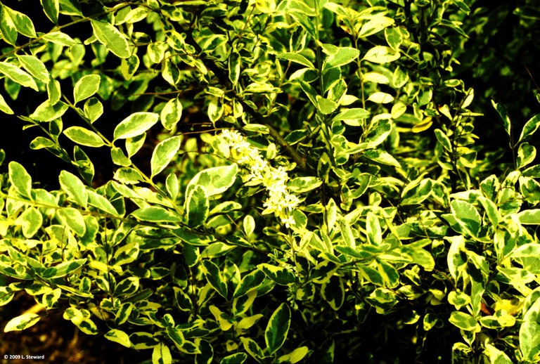 Showy variegated shrub.Invasive due to heavy fruit production.