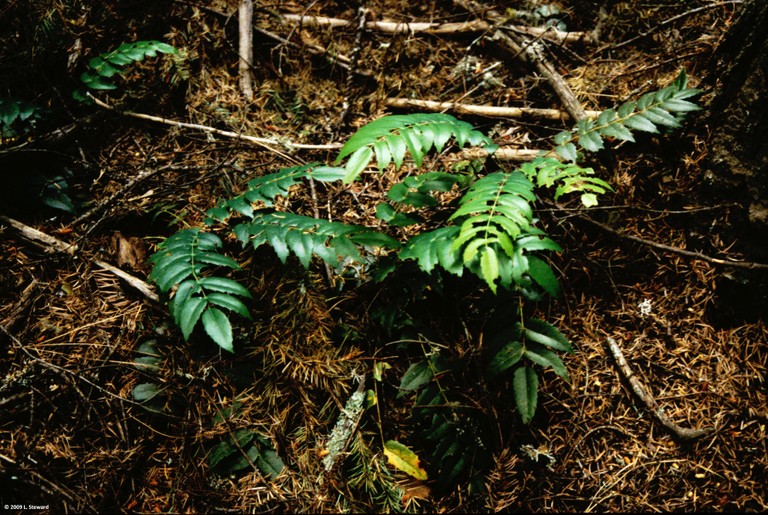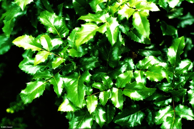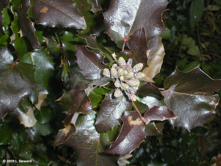 Glossy green foliage appearring to be a holly except with compound leaves. Bright yellow terminal floqwer clusters in early spring with bright blue fruit in summer.