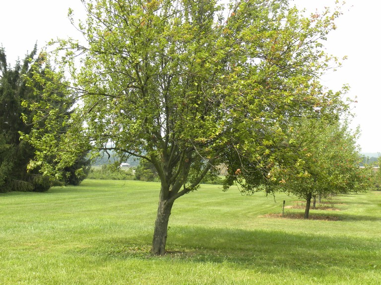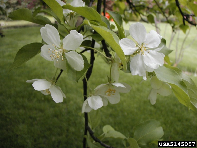 Older cultivars loose leaves early due to apple scab-fragrant flowers in spring.