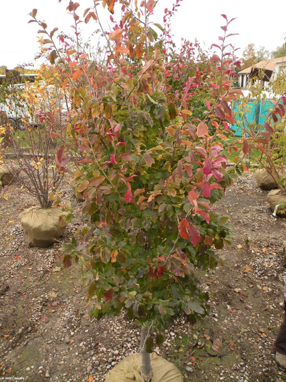 Showy small pink flowers in late spring. Orangred fall foliage color.