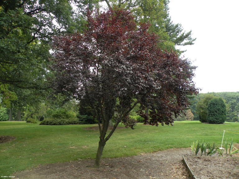 Red and purple leaf commonly used ornamental tree. Edible plum fruit.