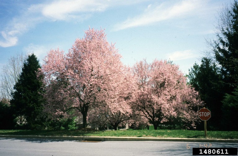 Double pink flowers borne in profusion. Flowers easily destroyed by a hard rain