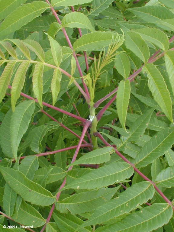 Bright red fall color on large compound leaves-red terminal fruit clusters-forms a copse (one tree forest)-dioeicious.