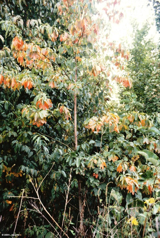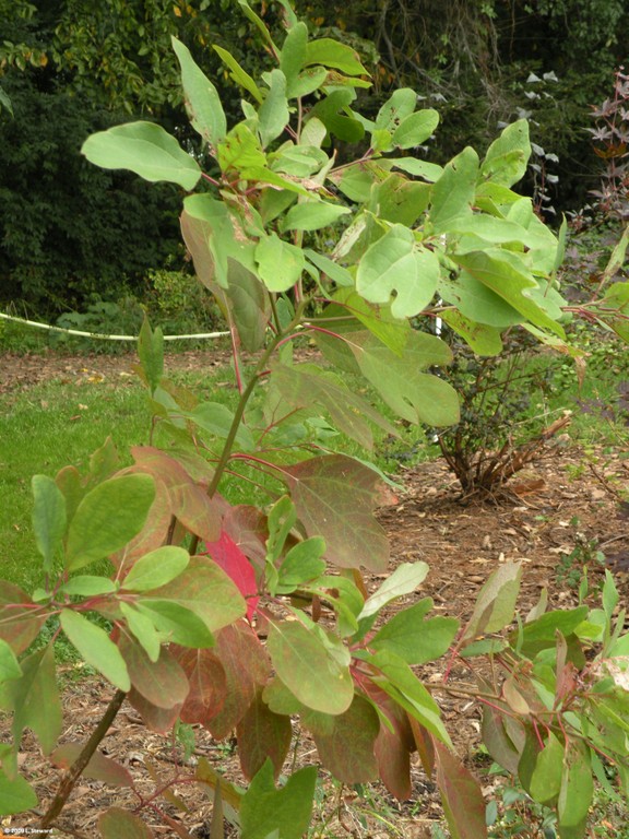Fragrant foliage. Oval, mitten, three finger and five finger glove shaped foliage all on one individual plant. Blue fruit on end of red stalk in clusters. Yellow flowers early in the spring prior to the leaf emergence.
