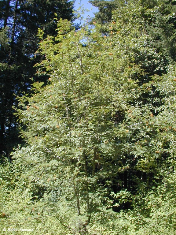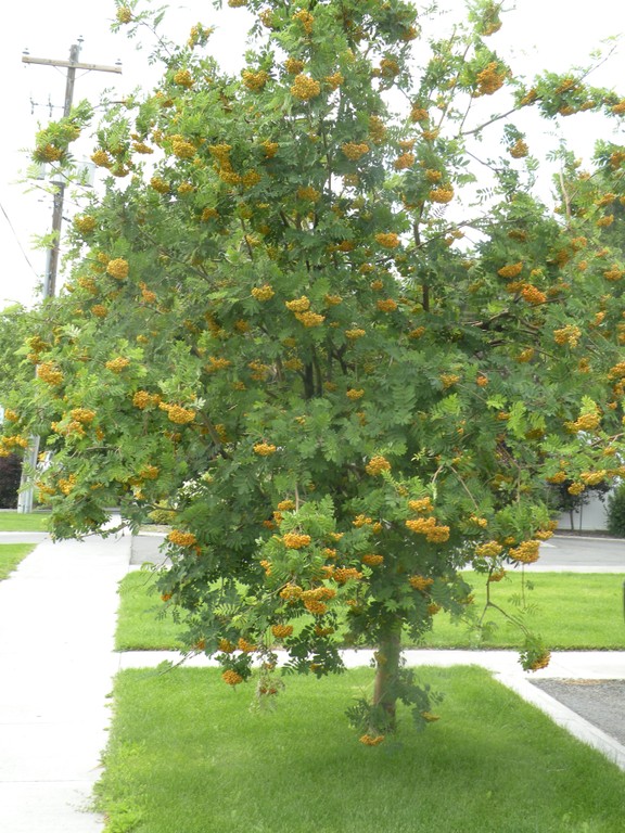 Attractive white flowers and orange fruit. European mountain-ash is very susceptable to rose family diseases. Tree form rather than shrub.