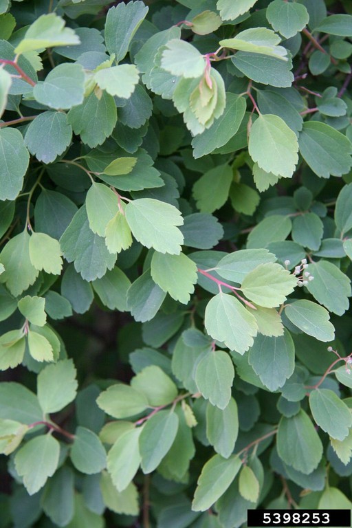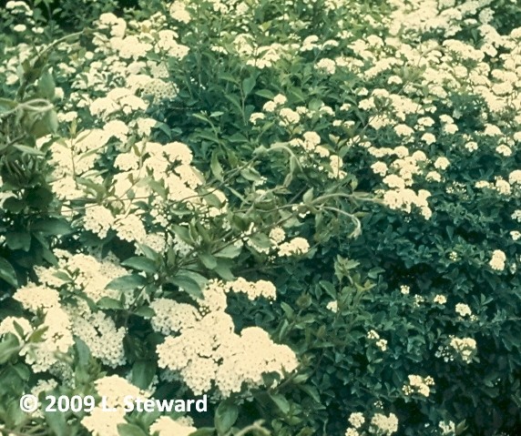 Last of spring flowering spireas to flower. Flowers are in inch diameter clusters along stems.