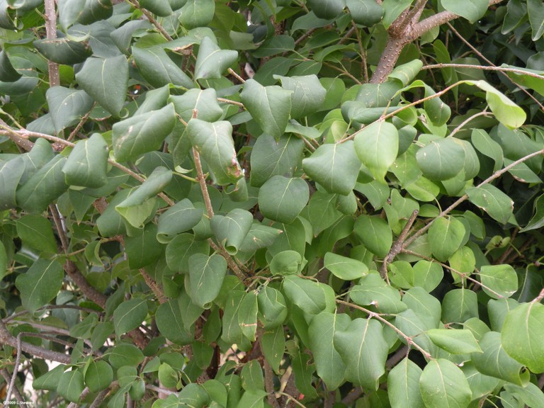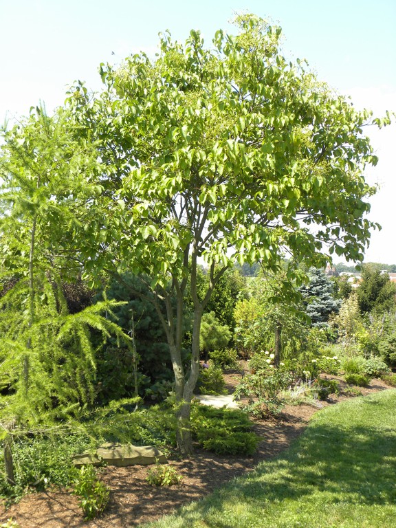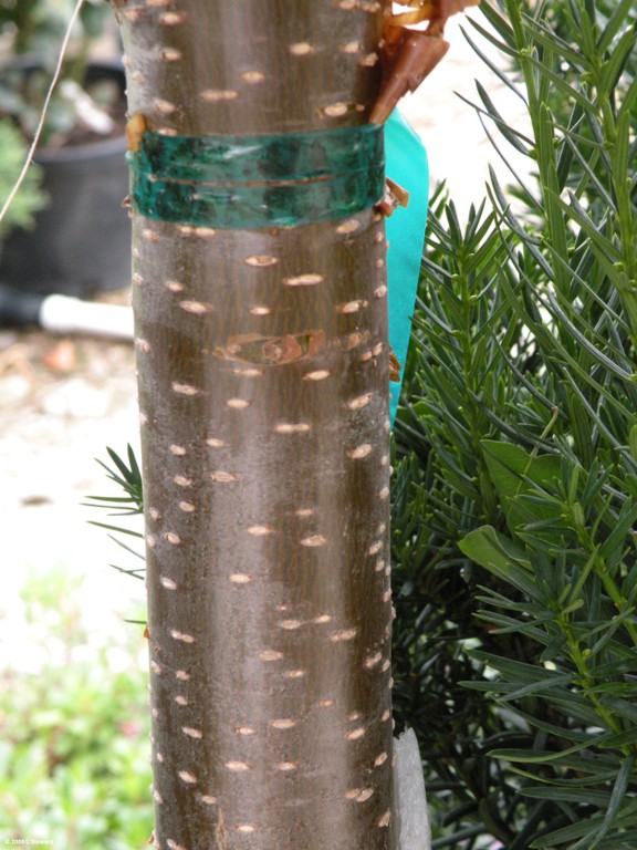 Cherry-like bark. Large showy creamy white flower clusters. Can be very odoriferous.