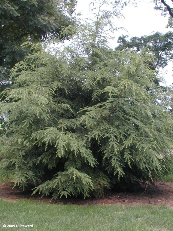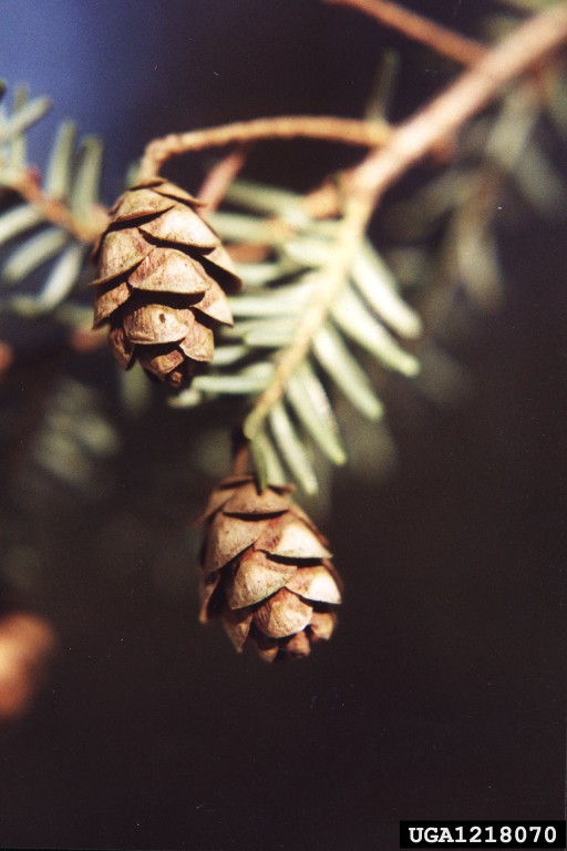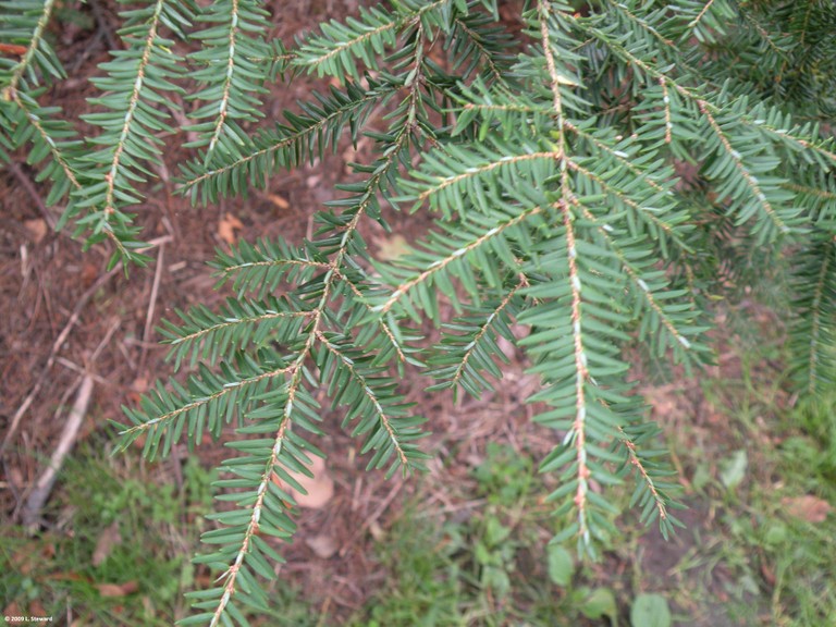 Flat needle with two white strips on underside-hemlock adelgid destroying natural stands in region.