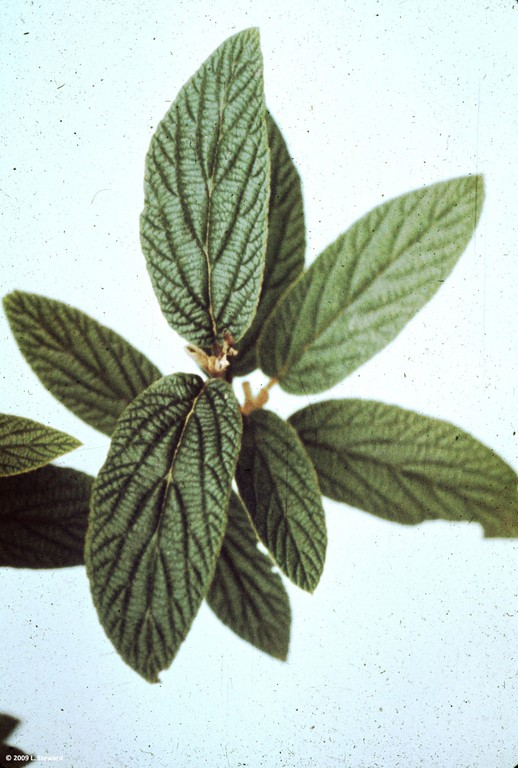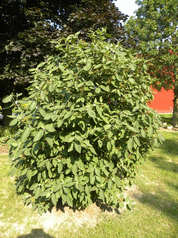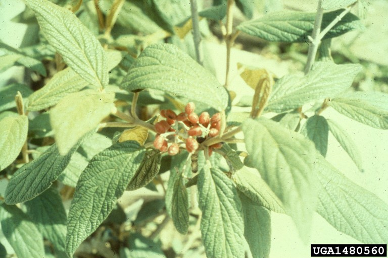Large textured dark green leaves-large clusters of bright red fruit in the fall-leaves droop giving the appearance that the plant lacks water.