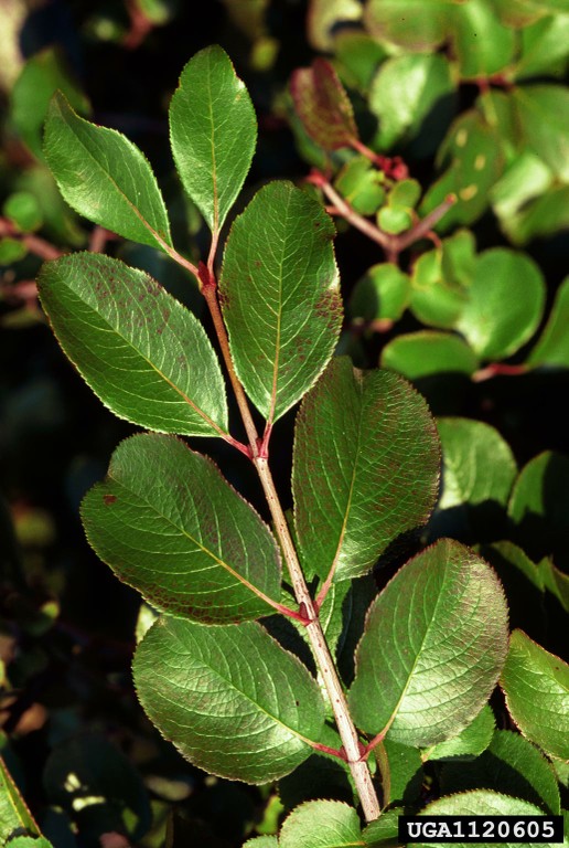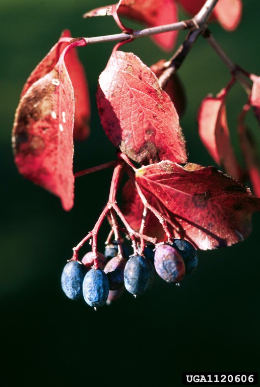 Southeastern native shrub with flat white flower clusters at same time as wild black cherry. Red fall foliage color.